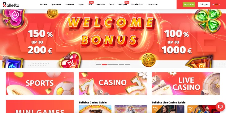 Wie der Name bereits vermutet lässt, handelt es sich beim Rolletto Casino, welches vorwiegend Roulette Spiele anbietet. Falsch gedacht! Selbst wir waren ein wenig überrascht, stattdessen erwartet dich hier knallharte Casino-Action vom Feinsten. Neben den üblichen Kategorien setzt man hier zusätzlich auf Bereiche für Sportwetten, Live Wetten, Minispiele und virtuellen Sport, natürlich darf auch der neumodische E-Sport hier nicht fehlen.