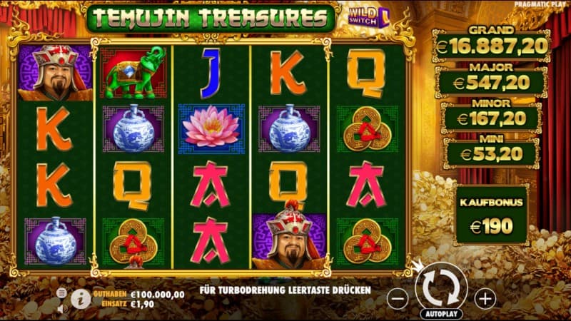 Jeder der Spielautomaten aus dem Hause Pragmatic Play verfügt über eine einzigartige Beschaffenheit. Dadurch hat jeder Slot einen individuellen RTP-Wert. Dieser steht dafür, welche Chancen Du im jeweiligen Spiel hast und wie viel % aller Einzahlungen auf längere Zeit wieder ausbezahlt werden. Wir haben den Caishen’s Gold Jackpot Slot von Pragmatic Play an die Spitze unserer Liste gesetzt – dieser weist eine bemerkenswerte Auszahlungsrate (RTP) von 97,08% auf.